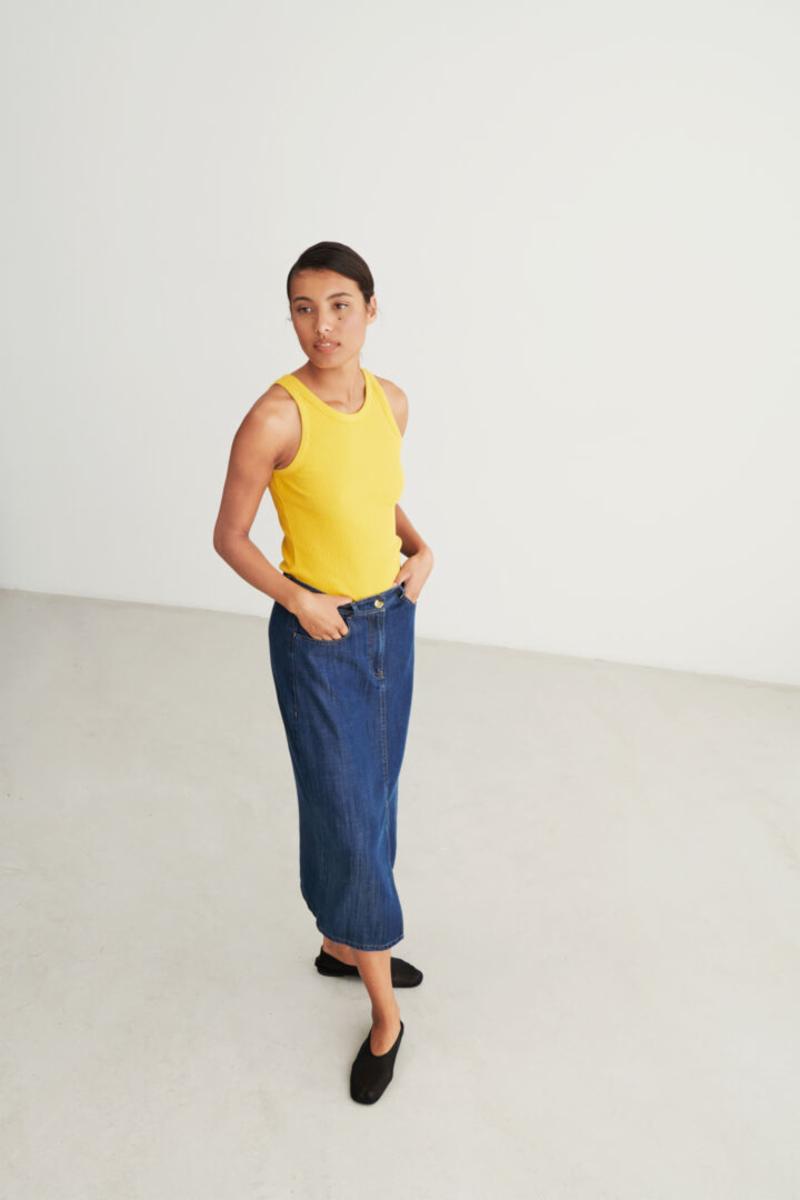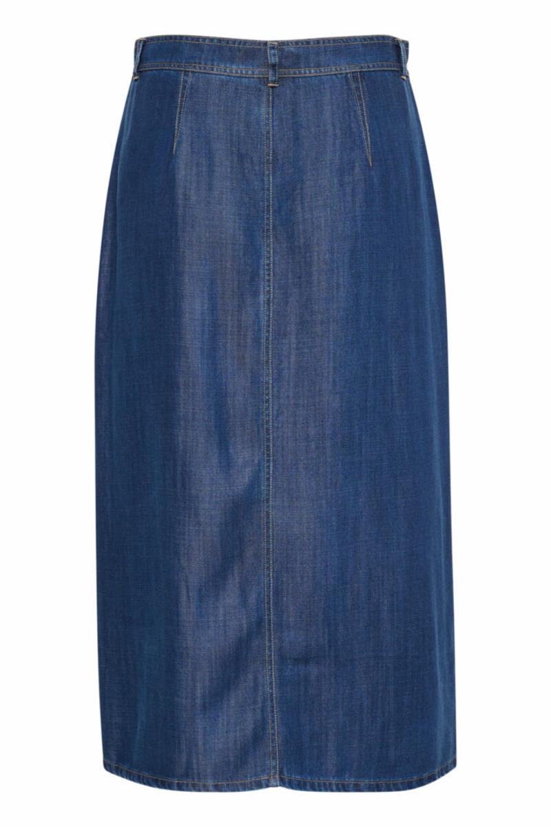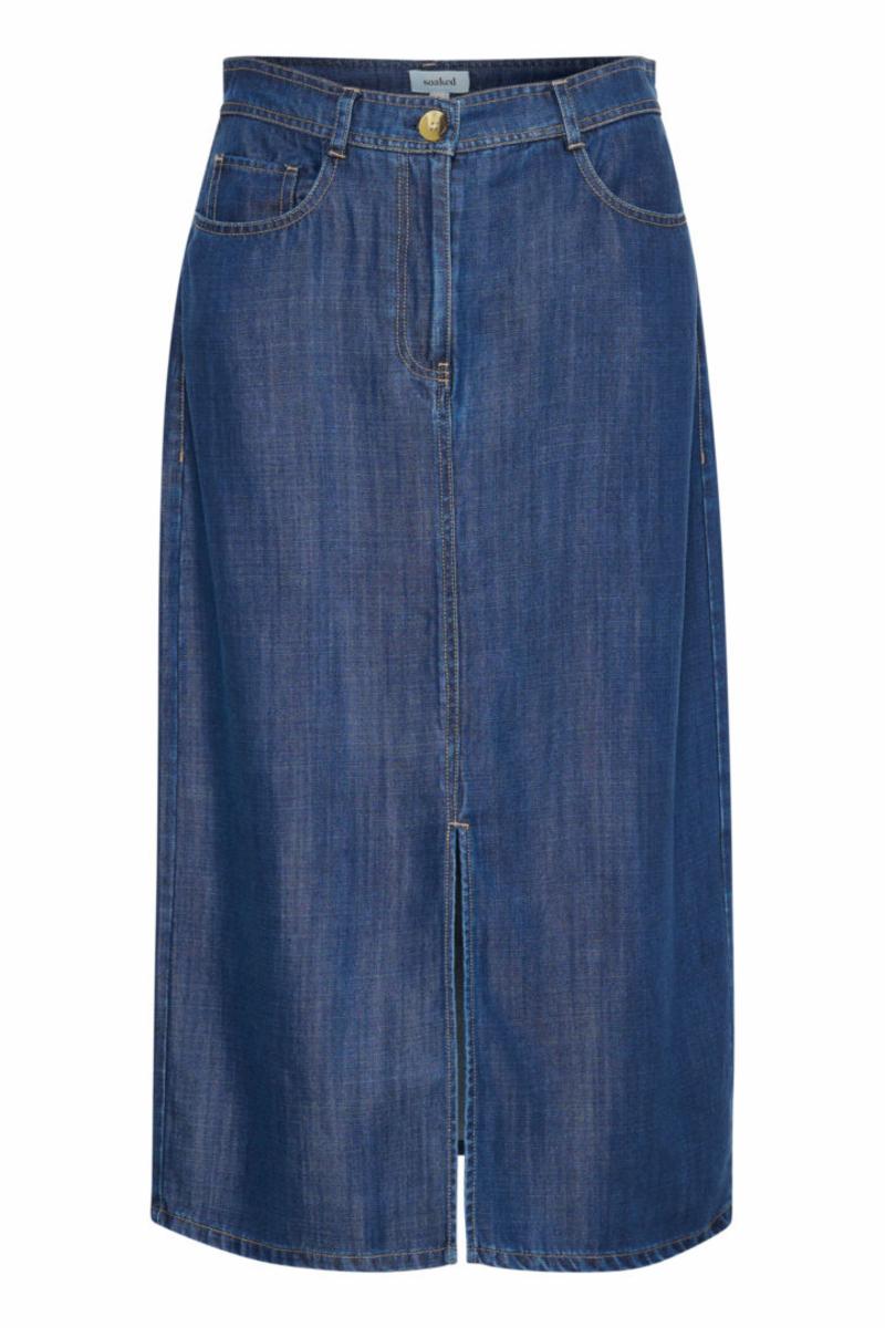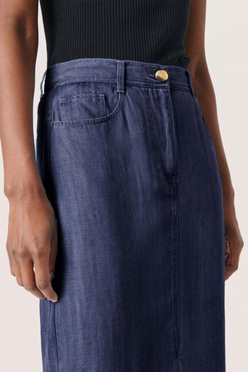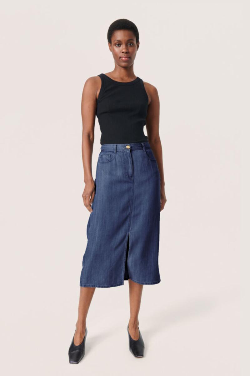 Midi skjørt i mørk blå denimfarge med et sliss foran. Modellen bruker størrelse M.