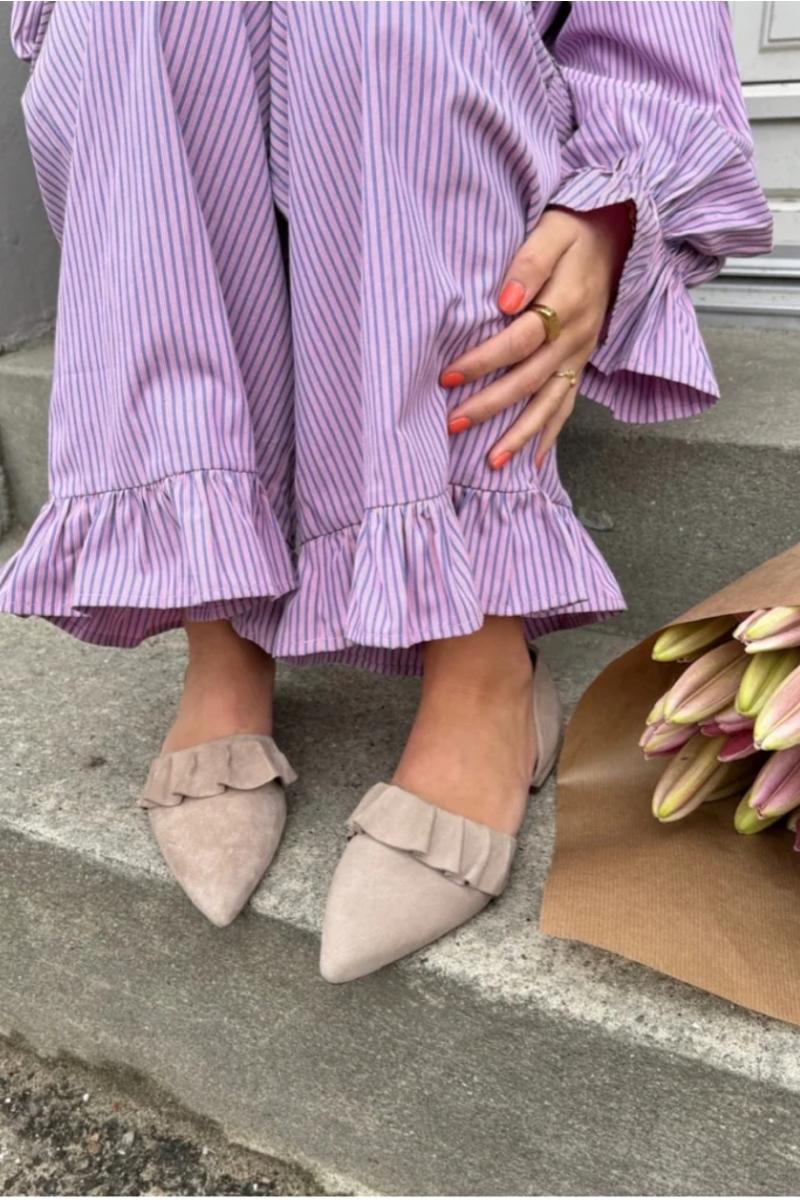 De vakreste feminine ballerinaskoene i semsket skinn, med en fin volangdetalj. Lav flat hæl, dekket i samme fine semsket skinn som skoene er laget av. Skoene har spesielle myke Copenhagenshoes latex skum innleggssåler som gjør dem supermyke og gir god komfort.