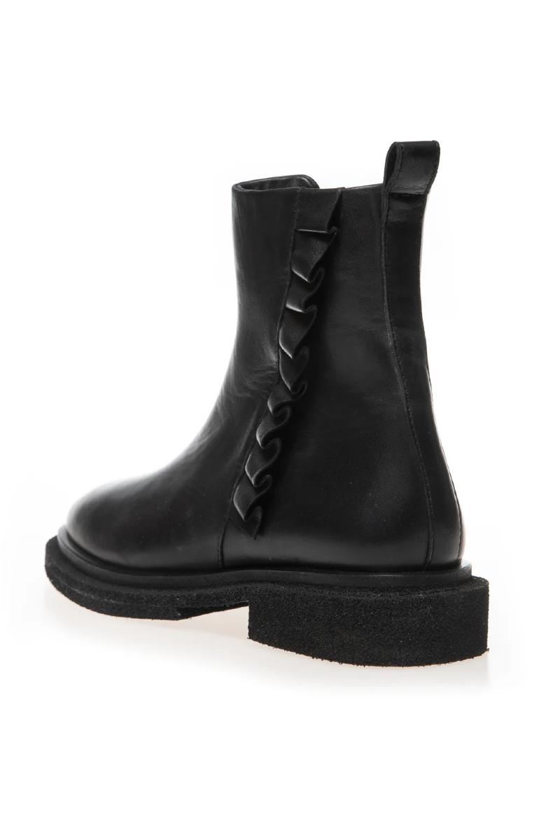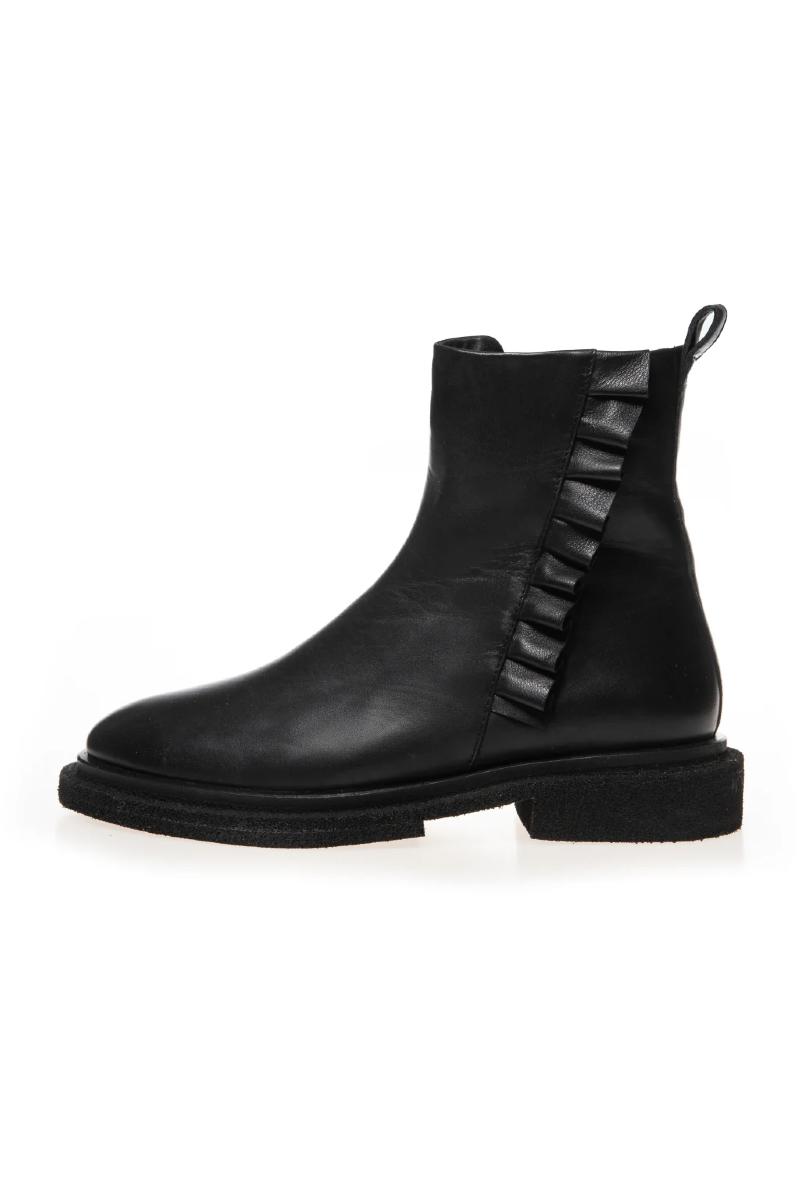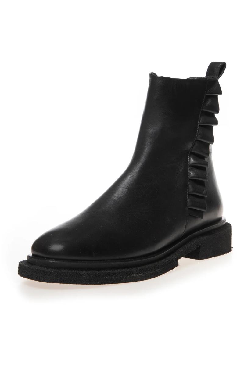 Black leather Chelsea boot with feminine wrinkles on the outside. The boot has special lightweight soles and elastic on the inside. The boot is best for a regular or narrow foot.