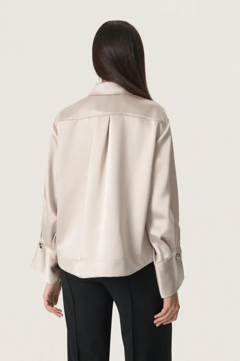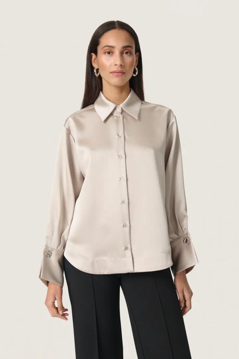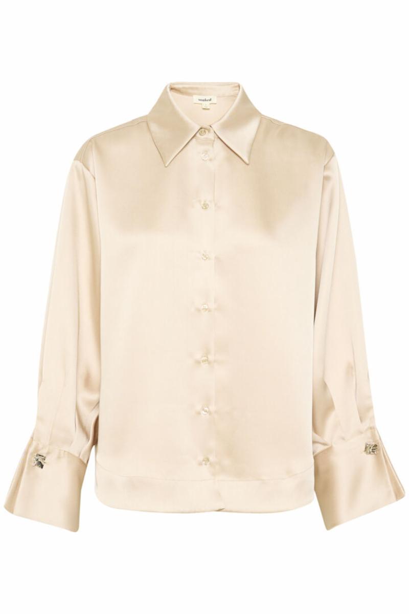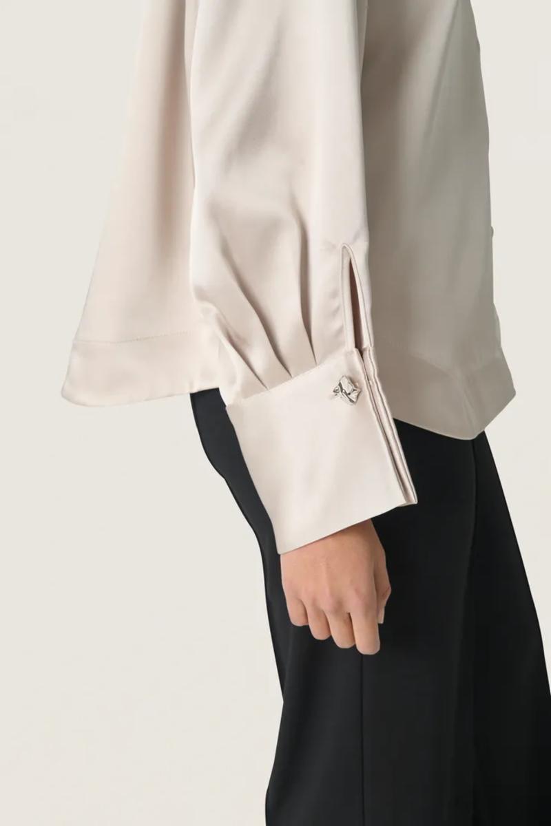 Elegant satengbluse med klassisk skjortekrage og skjult knappelukking. Designet med lange ermer som avsluttes med mansjetter og dekorative spenner for et eksklusivt preg. Modellen er 176 cm høy og bruker størrelse M.