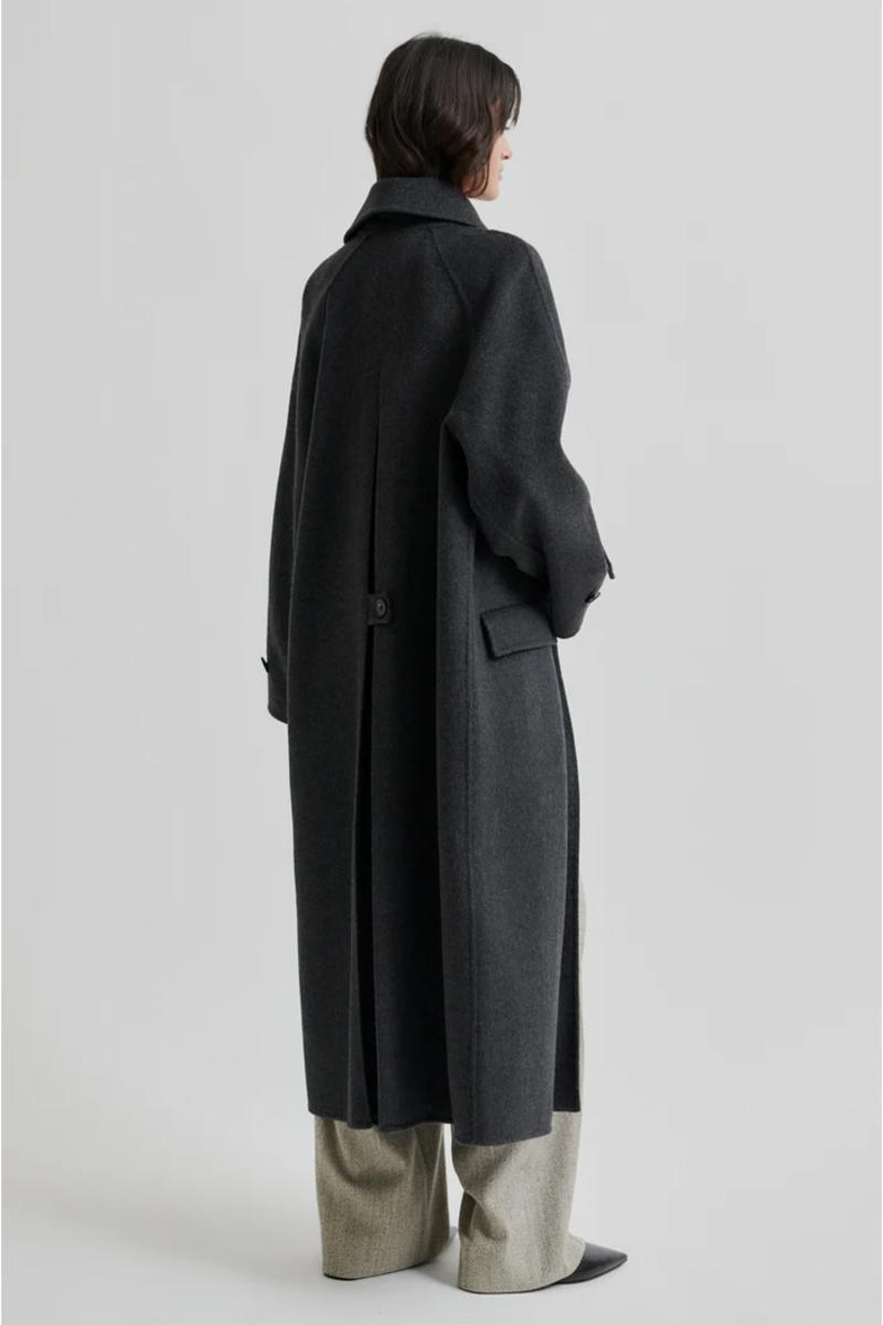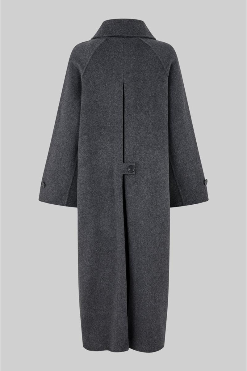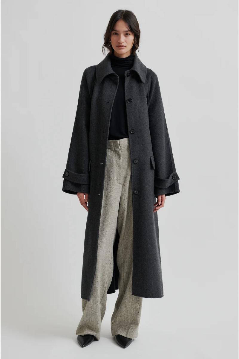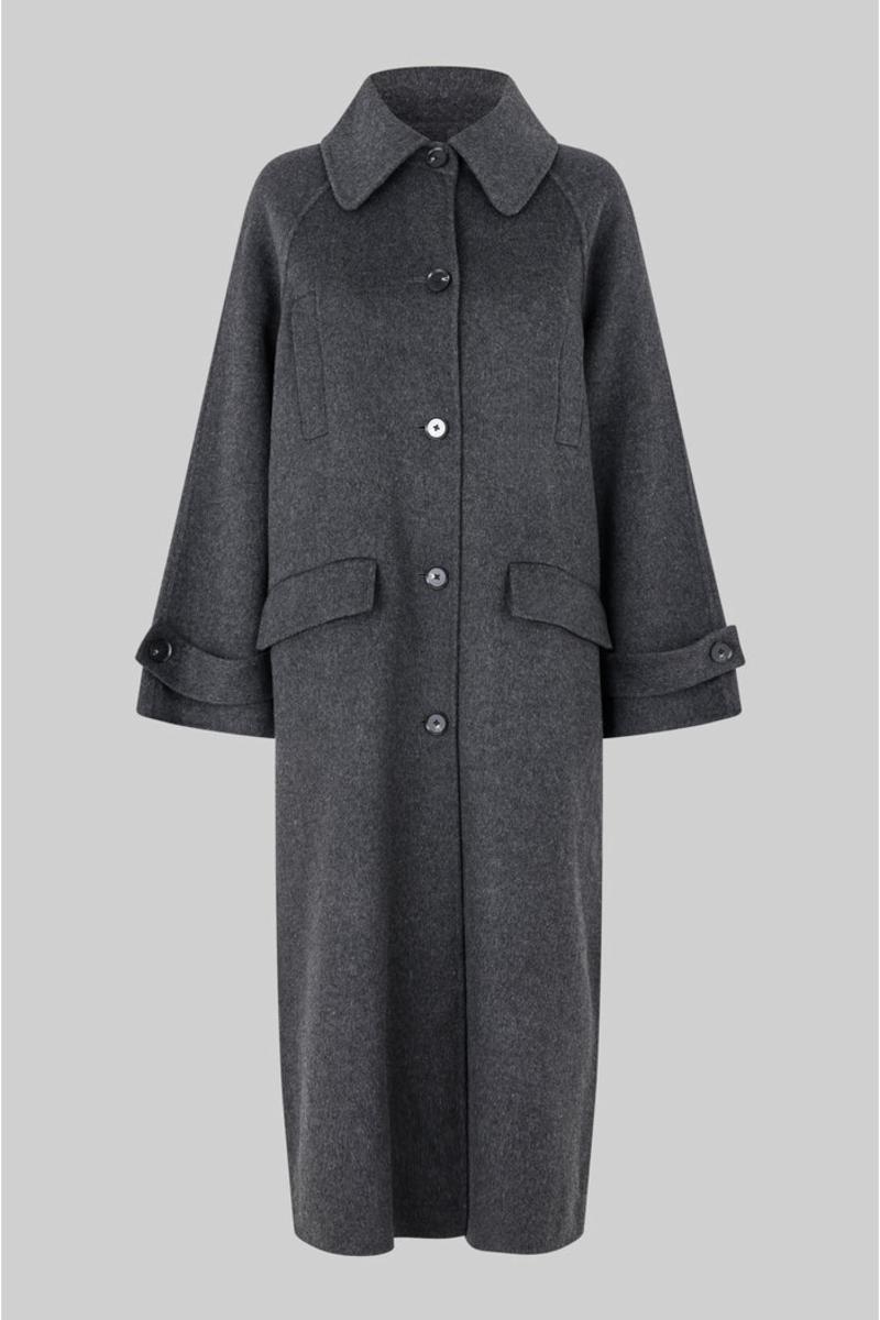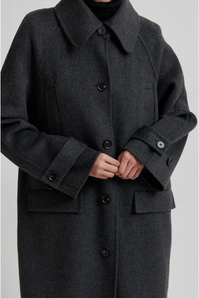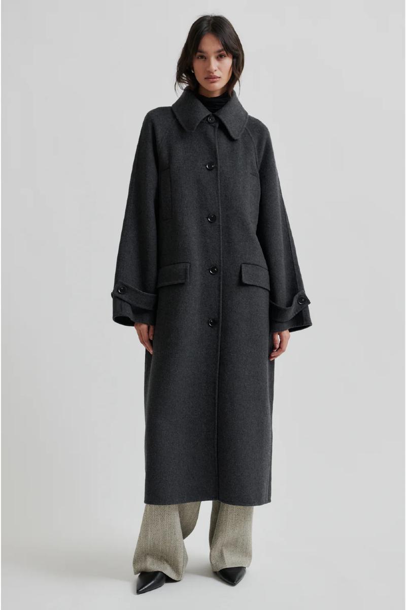 Second Female buttoned coat. Made in a soft and slightly textured wool blend with melange quality. Featuring a regular collar with button fastening at the front and raglan sleeves. Straps with buttons at the cuffs and back. Two chest pockets with side opening and two flap pockets. Regular fit, with long, straight silhouette.