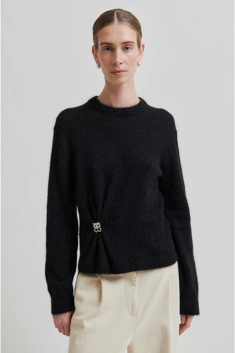 Second Female pullover with logo brooch. The pullover is made in a soft and stretchy mohair-wool blend with slightly fluffy quality. Featuring a round neckline, dropped shoulders and long sleeves. Detachable silver logo brooch fastened at front. Regular fit with defined waist when brooch is attached.