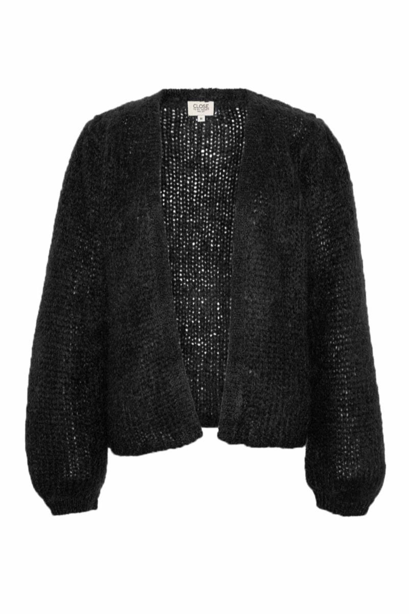 Vakker og nett cardigan i løs strikket kid mohair, håndlaget i Nepal. Den har en liten rynk på skulderen som gir en veldig fin effekt uten å bli for mye "puff". Bærer selvsagt hjertet i nakken