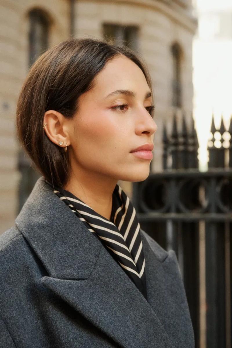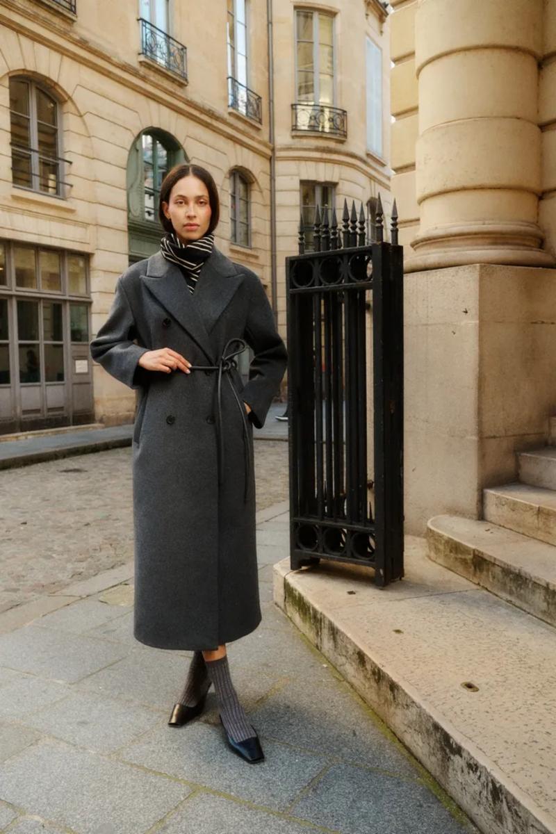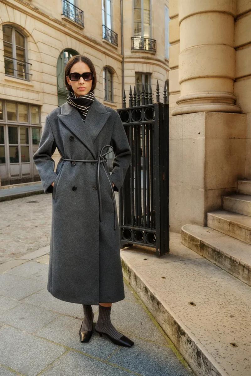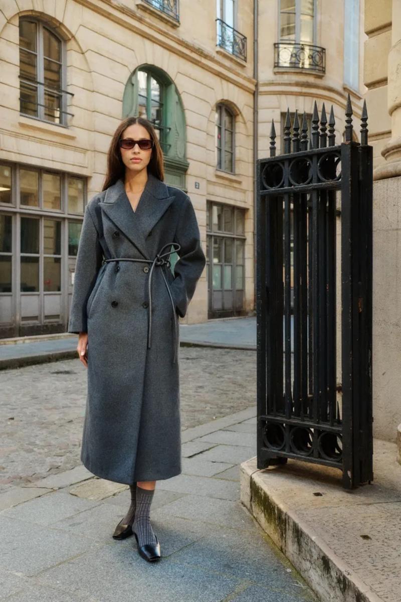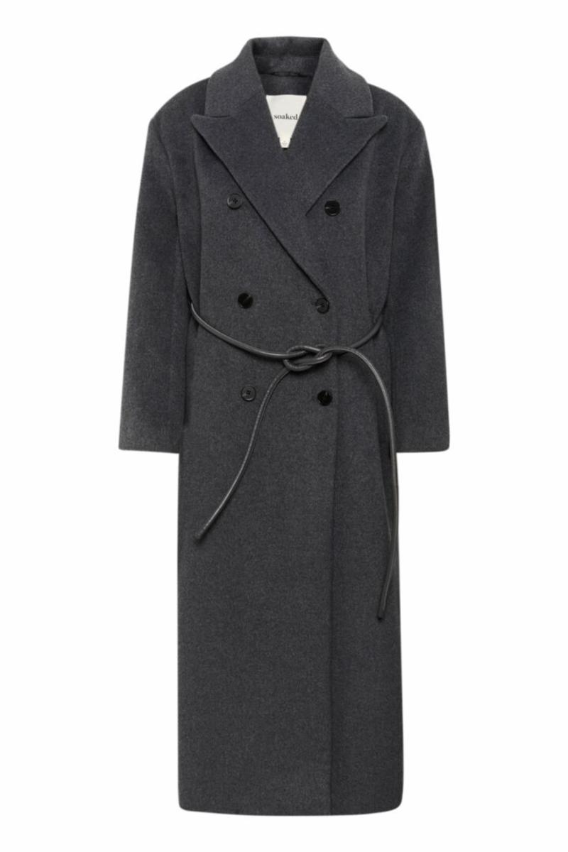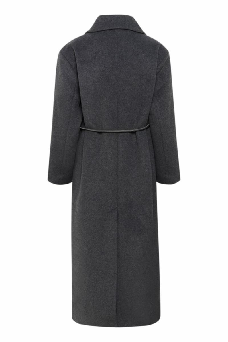 Elegant, lang kåpe i mørk grå med dobbeltknepping og smalt belte i livet. Den strukturerte fasongen og rene linjene gir et sofistikert uttrykk.