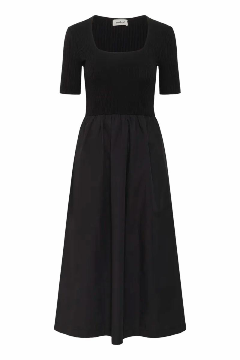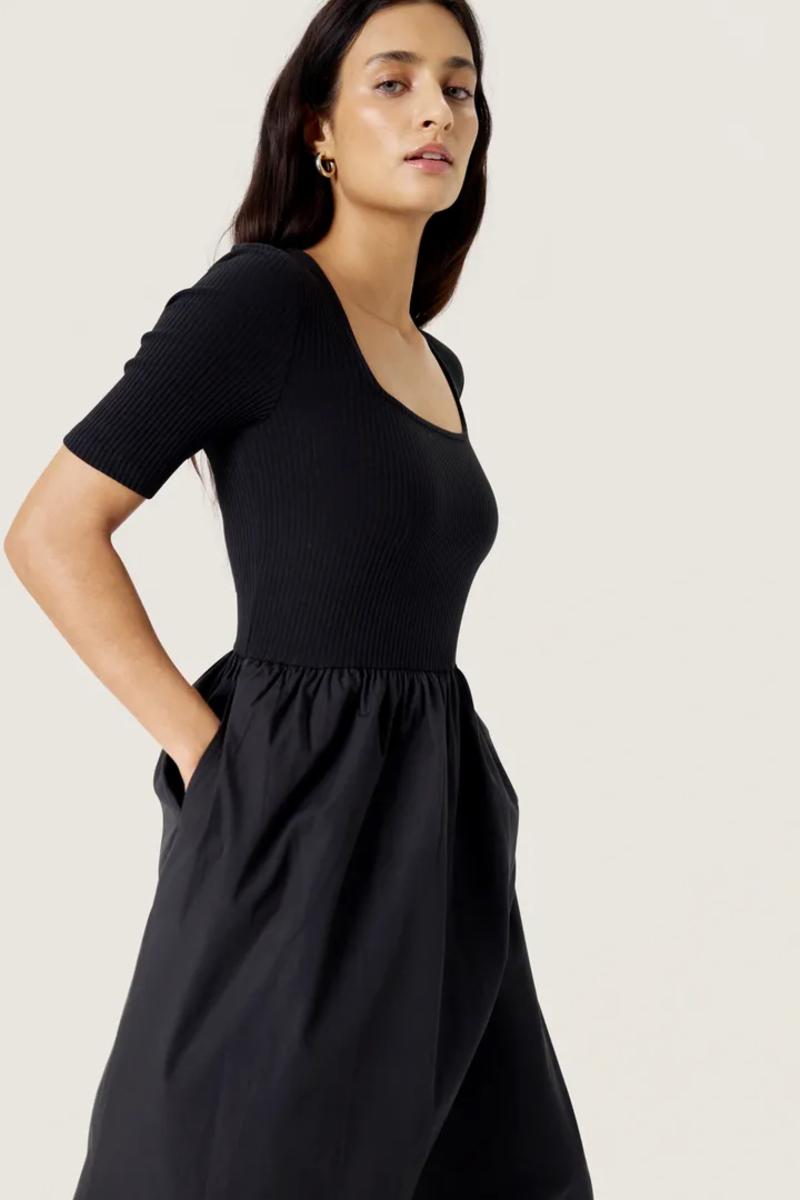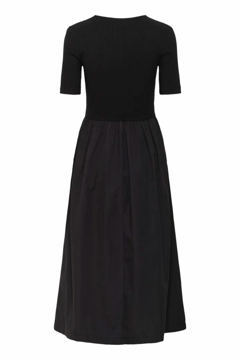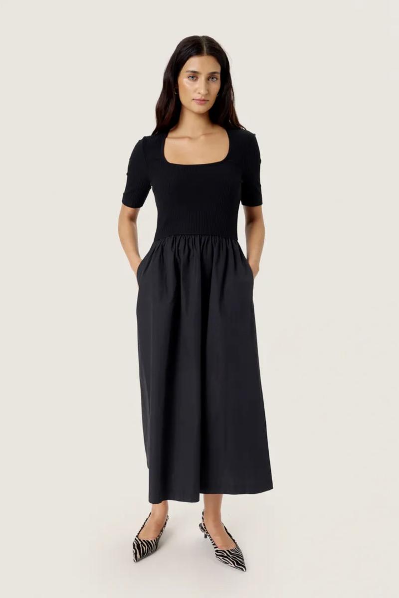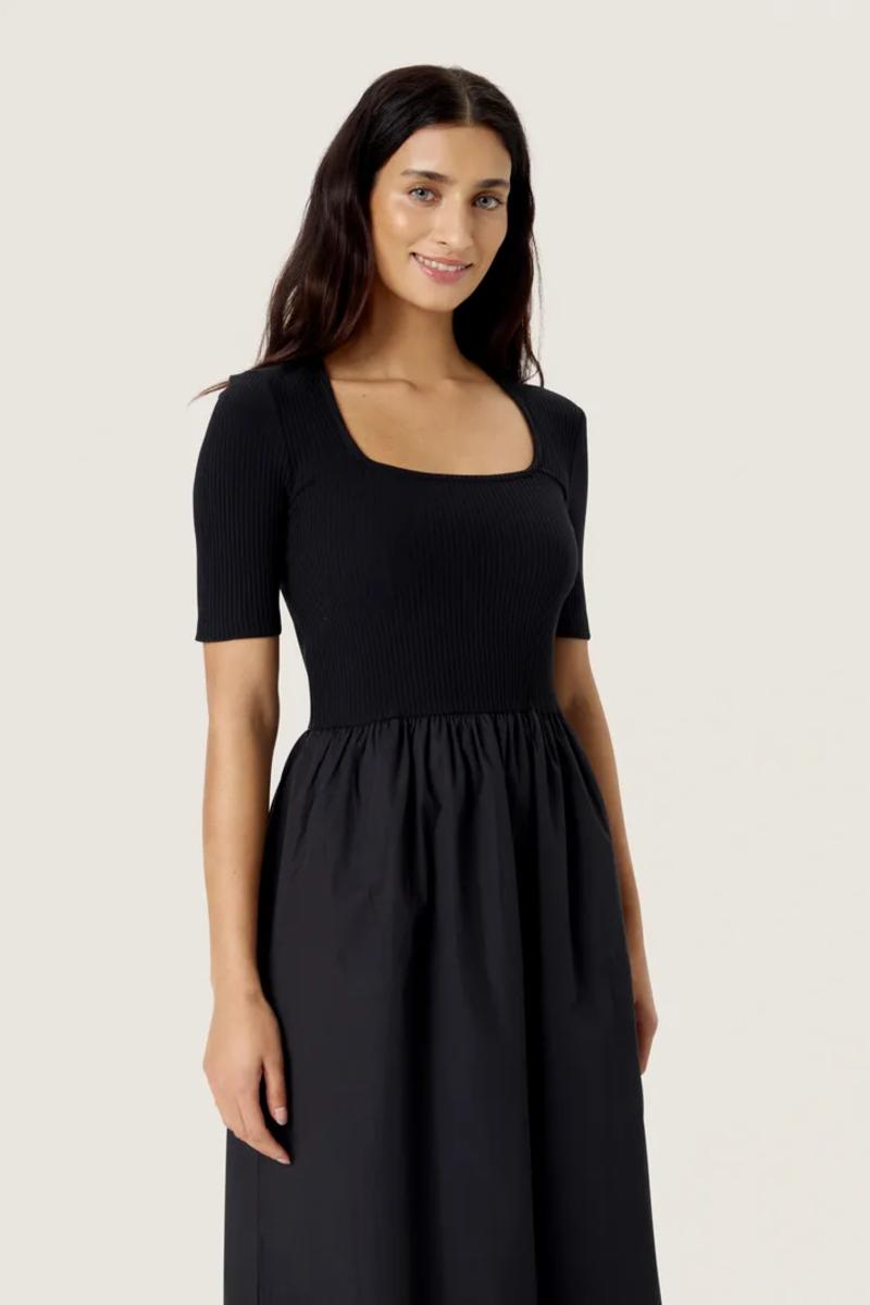 Sort kjole med smocket overdel og firkantet utringning. Ribkvaliteten gir en tettsittende passform, mens skjørtet faller lett. En stilren og behagelig favoritt til både hverdag og fest.