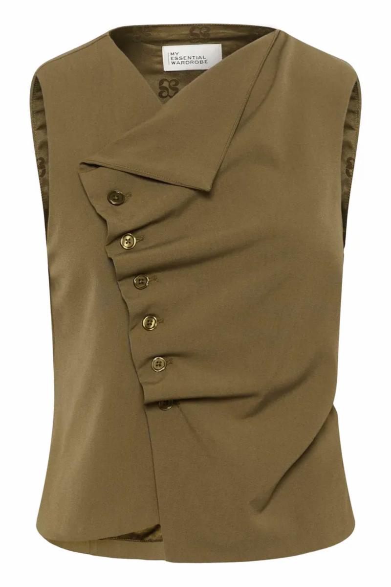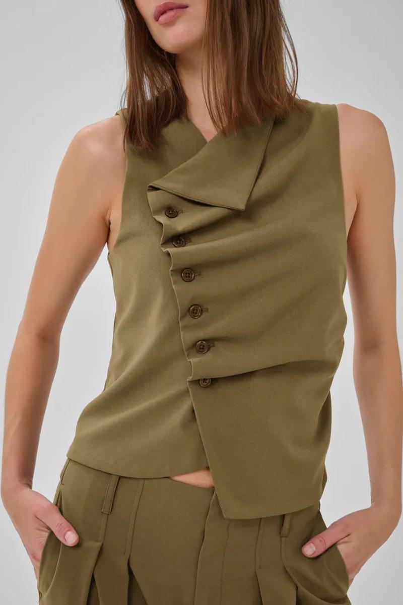 Ermeløs dametopp med asymmetrisk knappelukning og moderne drapering. Skreddersydd passform og mykt stoff gir komfort til både jobb og fritid.