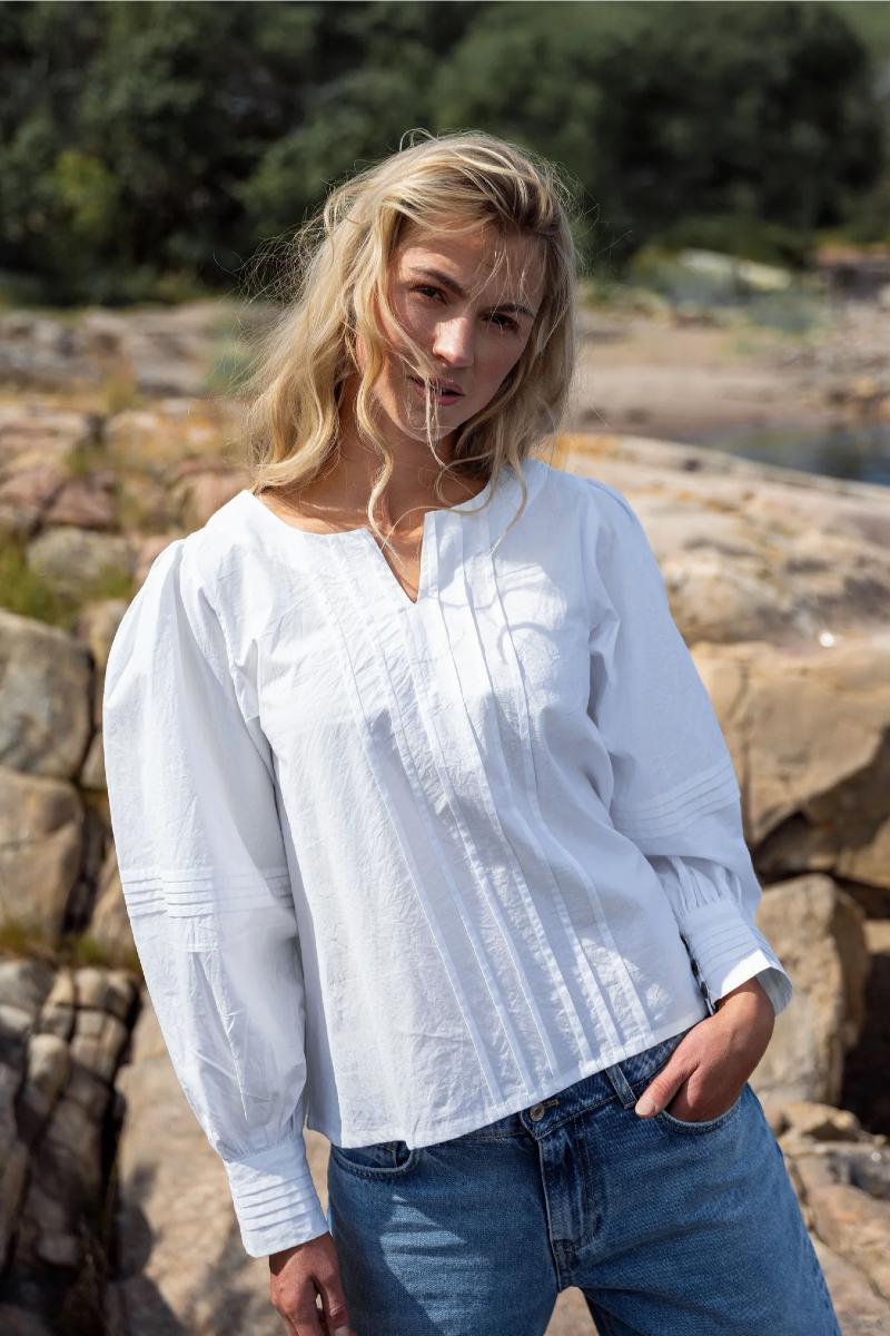 Elena blusen har en diskret ballong erm, med vakre pleats, liten v-skjæring i halsen og med en videre passform. Dette er blusen til dine kule jeans! Litt romslig i størrelsen, sjekk dine mål