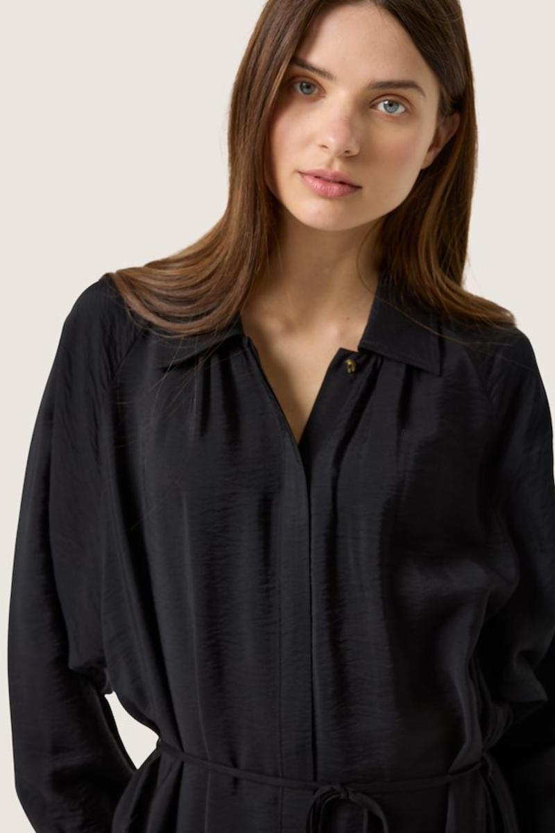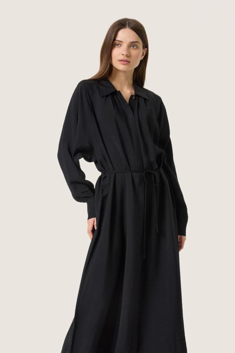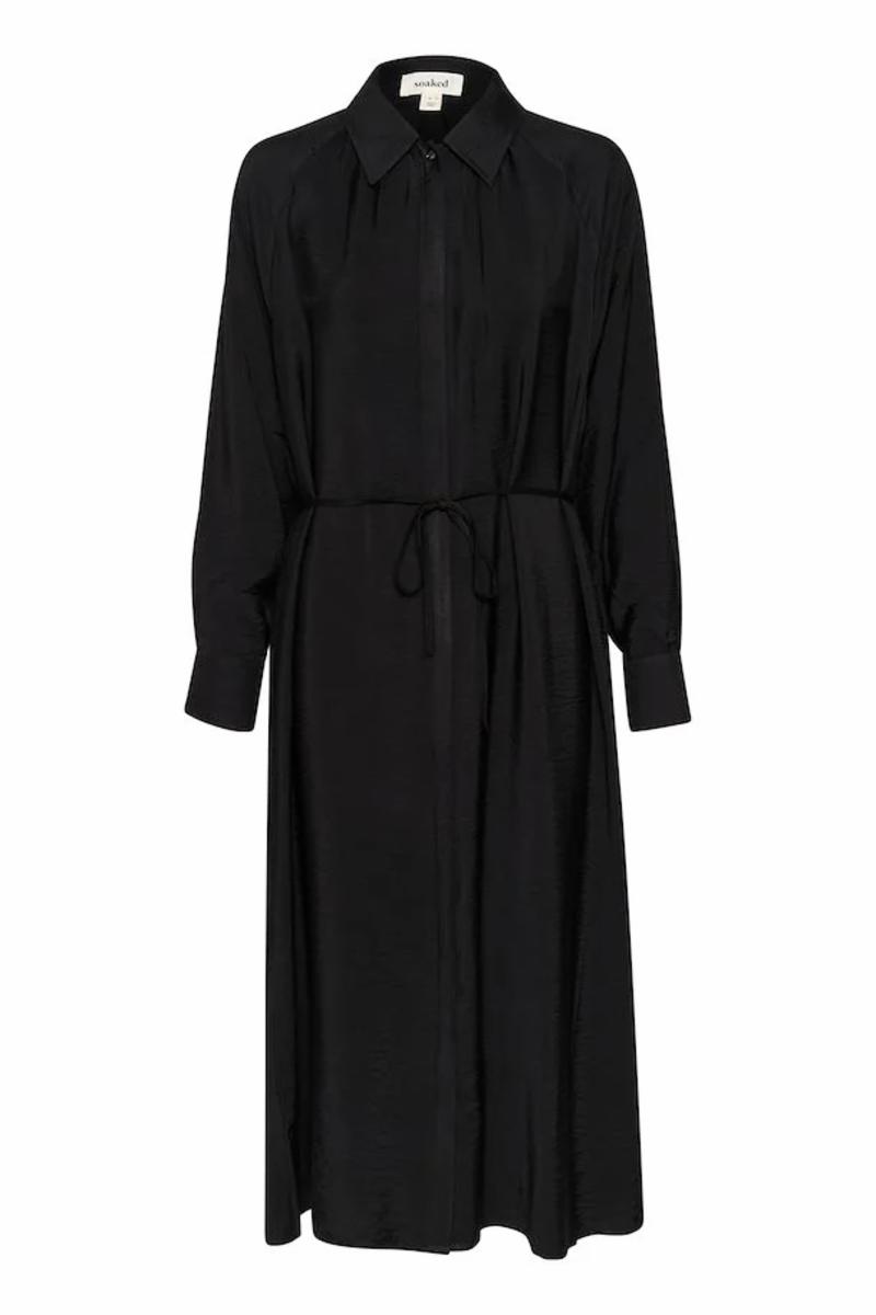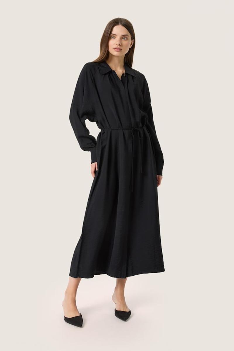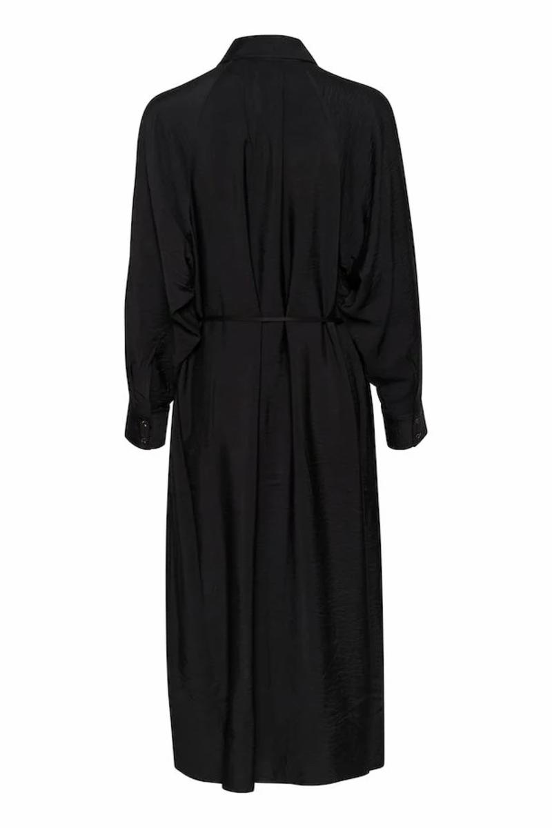 Lang kjole med knappelukking, midjebånd og lange ermer. Kjolen har en klassisk krage og en løs passform som gir et elegant og stilrent uttrykk. Modellen er 176 cm høy og har på seg størrelse M.