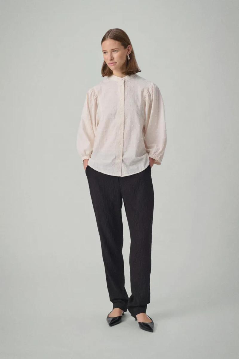Lett bluse i en myk kremfarge med vevd struktur. Ballongermer og knappelukking foran gir et avslappet og elegant uttrykk. Modellen har på seg str. M.