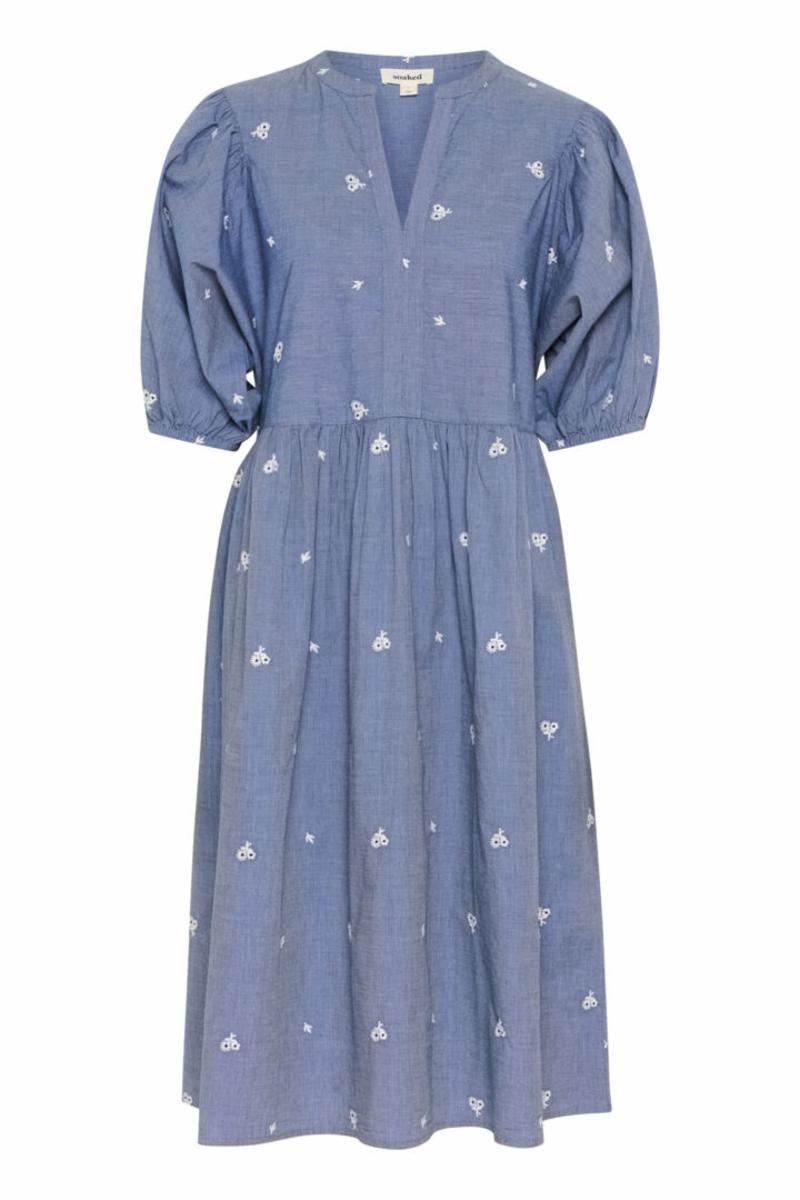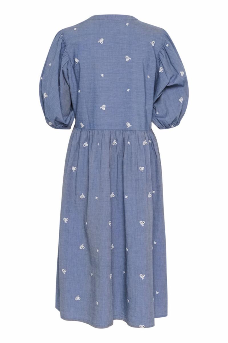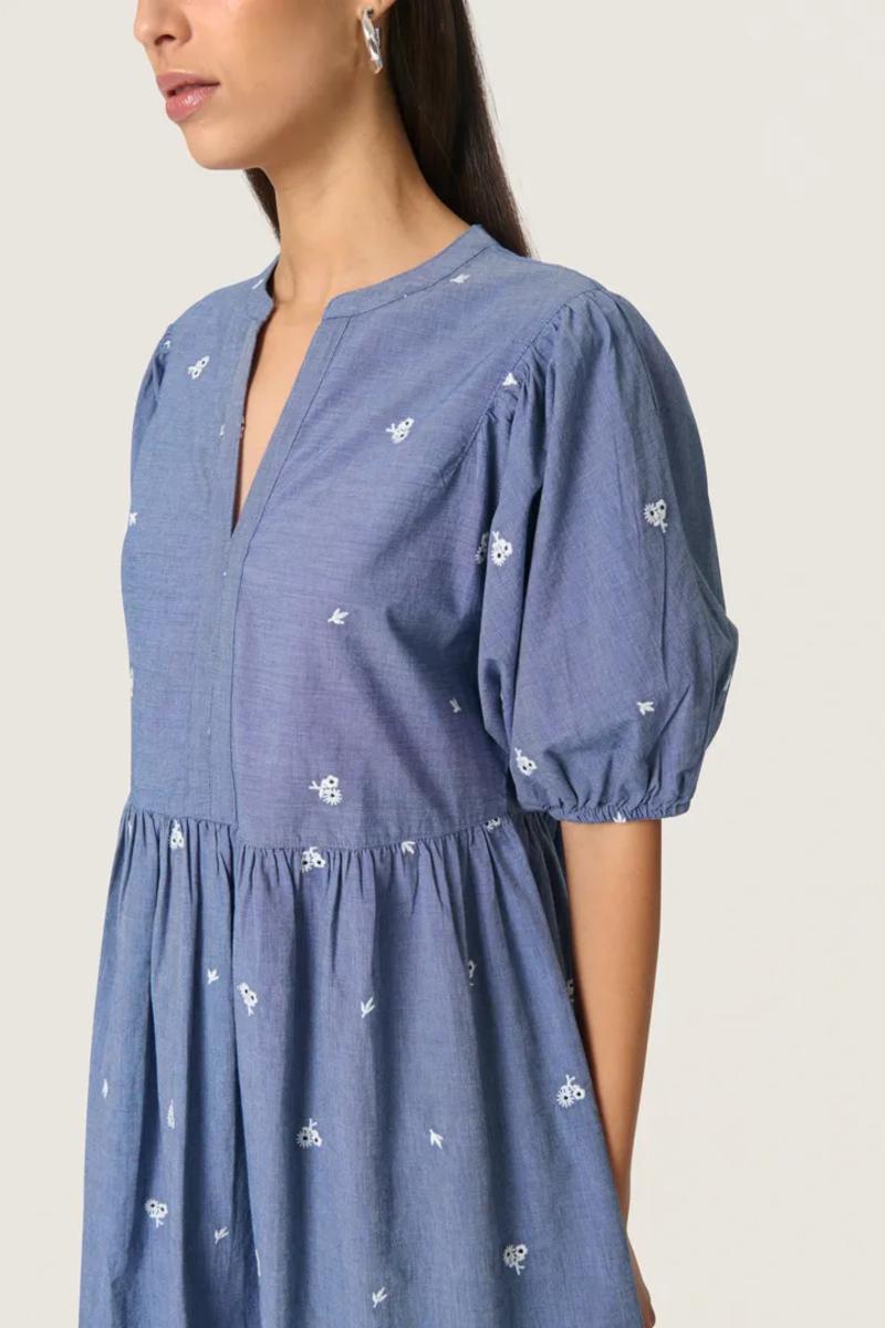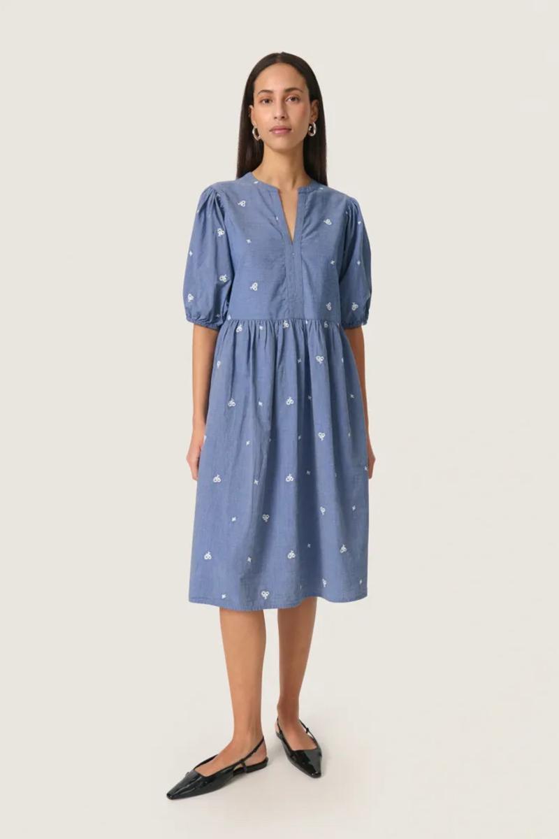 Vakker knelang kjole i blått med delikate broderidetaljer. De korte puffermene og V-utringningen gir et feminint uttrykk, mens den løse passformen sikrer komfort hele dagen. En allsidig kjole som passer både til hverdags og fest. Modellen er 180 cm høy og har på seg størrelse M.