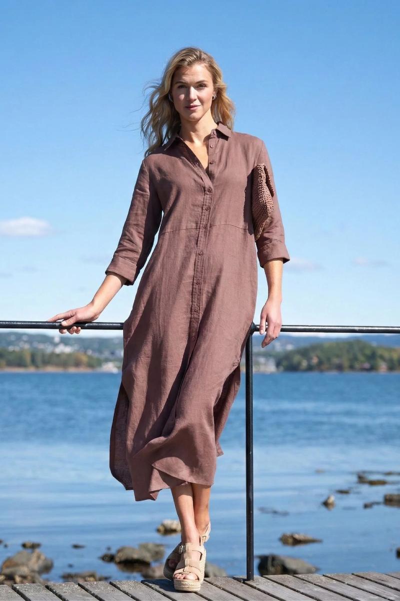 Leila er en lekker midi kjole som du enkelt pynter opp og ned. Den er forknappet hele veien, har krage og gode lommer og splitt i begge sidene. Bak er det et rynket parti som gjør at den faller så fint nedover ryggen. 3/4 erm gir både et sporty og elegant uttrykk.